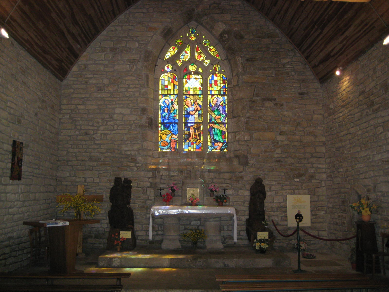 L’abbé Binard ne s’arrête pas là : il faut une chapelle. En 1960 il obtient l’autorisation de « récupérer » une des deux chapelles de Guéhenno, à 15 km de là, en très mauvais état : la chapelle Saint Marc, à côté de la chapelle Notre-Dame du Mont. Elle est démontée pierre par pierre… et remontée près du chemin de croix. Bénie le 15 août 1962, elle est consacrée à Saint Joseph.