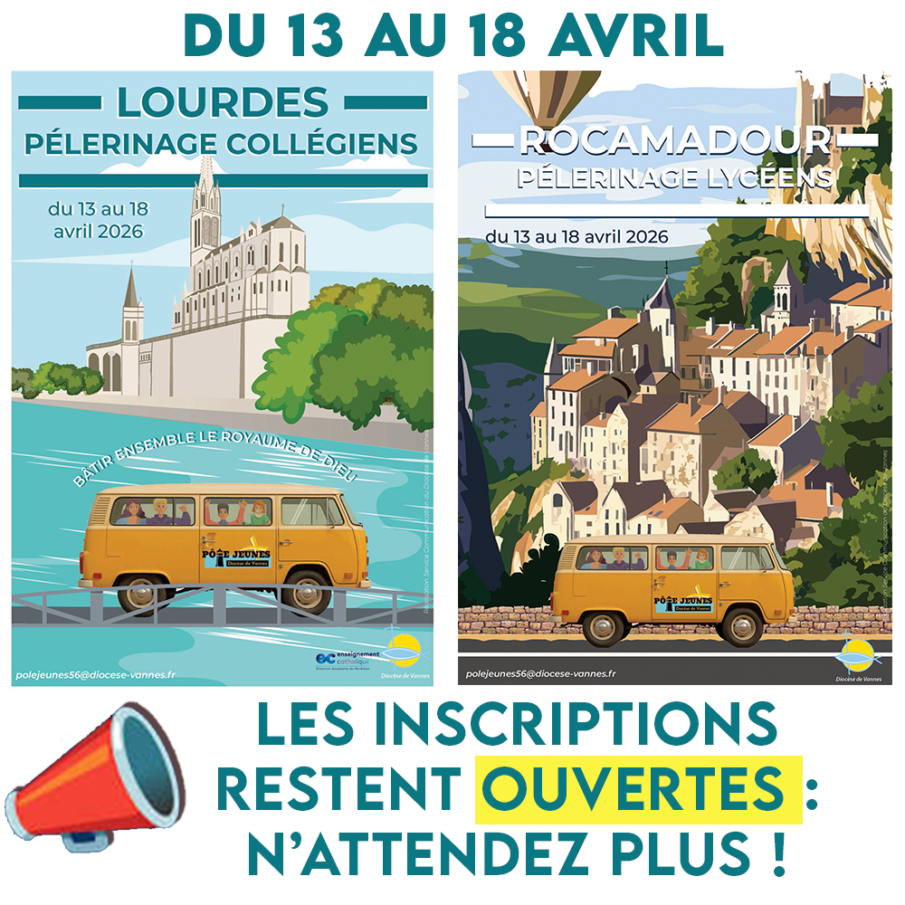 Du 13 au 18 avril prochains, les collégiens et lycéens du Diocèse de Vannes vivront un pèlerinage au sanctuaire marial de Lourdes pour les premiers et de Rocamadour pour les seconds : un temps fort exceptionnel pour se rapprocher du Seigneur, partager sa foi avec des frères et sœurs chrétiens de son âge, accompagnés par des prêtres et des animateurs stimulants ! DERNIER APPEL : Quelques places sont encore disponibles, alors n’attendez plus pour vous inscrire.