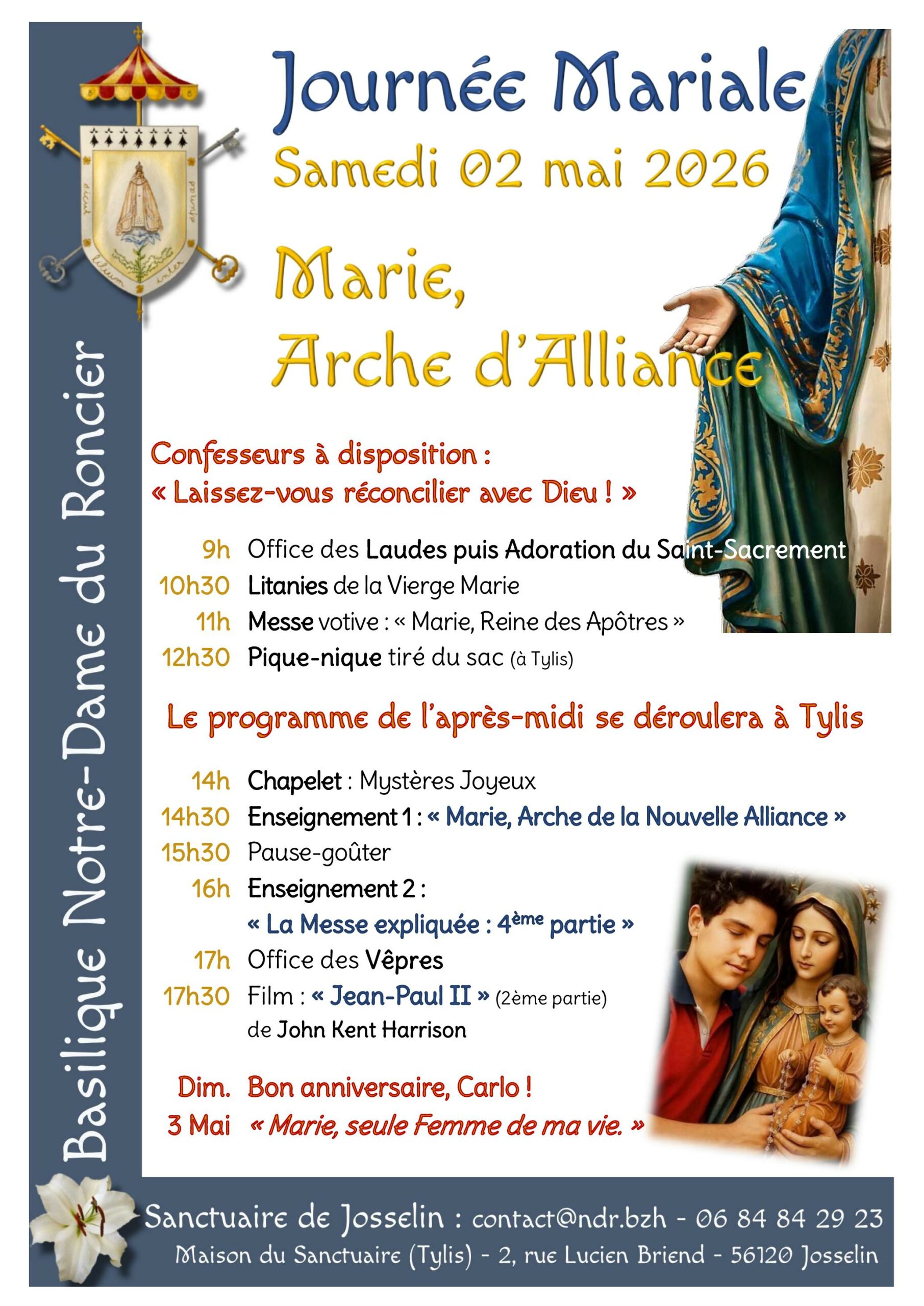 En l’honneur du mois de mai consacré à la Vierge Marie, le sanctuaire Notre-Dame du Roncier de Josselin nous invite à passer la journée du samedi 2 mai avec Elle et sous Sa protection.