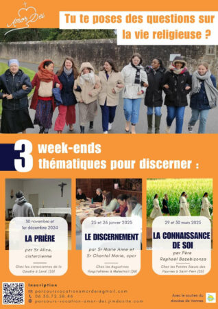 Les week-ends Amor Dei pour but de donner aux participantes des clefs pour le discernement de leur vocation, des jalons dans leur réflexion… Ce week-end aura lieu à Saint-Pern (35), chez les Petites Sœurs des Pauvres, avec l’intervention du Père Raphaël Bazebizonza, sj.